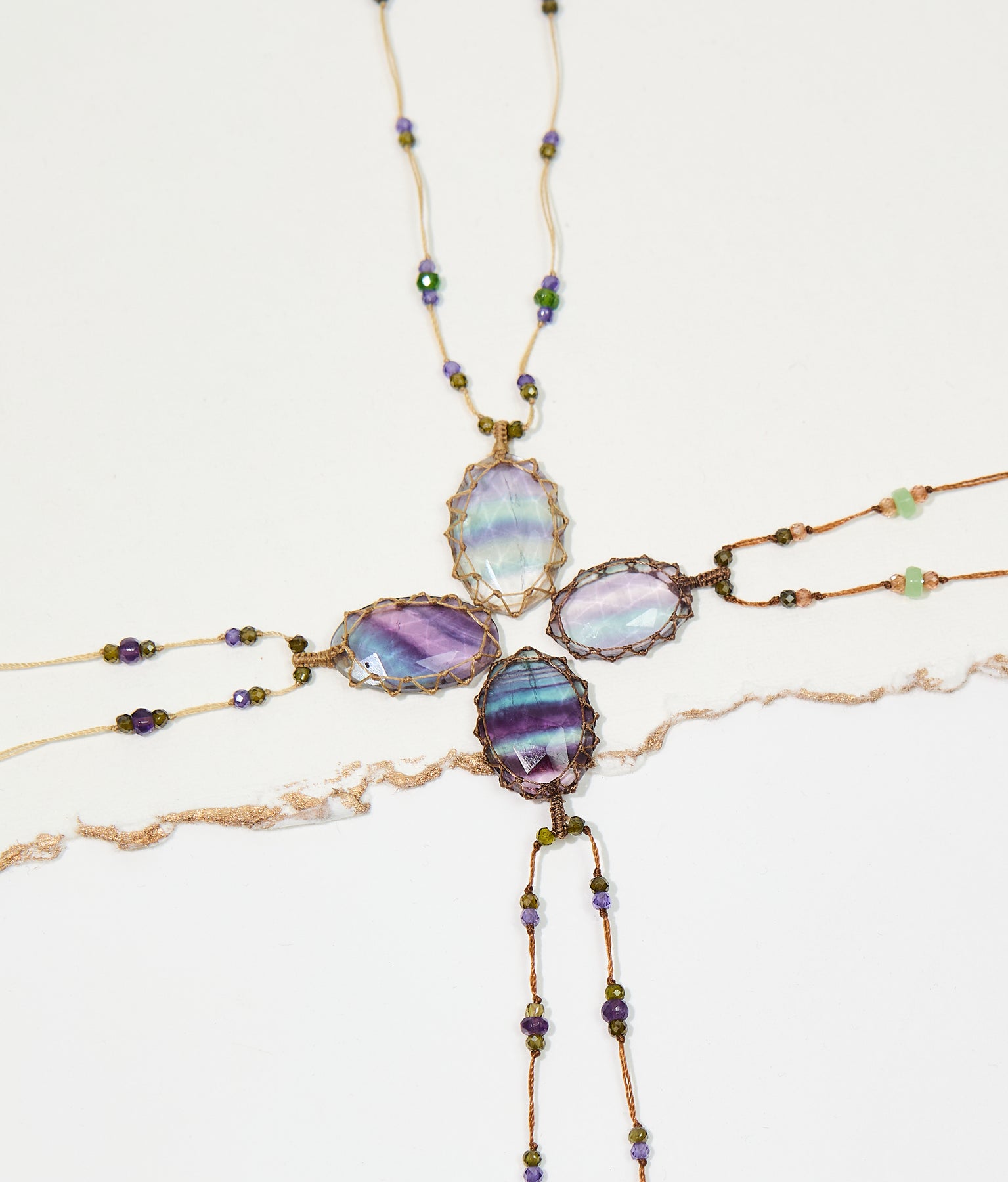 Collier Court Tibétain - Fluorite Rainbow - Mix Tsavorite & Purple - Fil Beige
